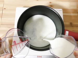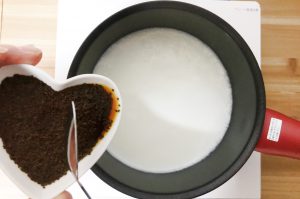 ⓶手鍋に牛乳と水を入れ、加熱します。