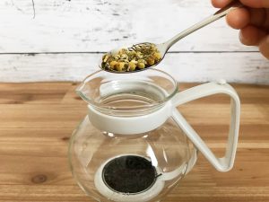 ⓵キャンディ4gとカモミールティースプーン1杯を温めたポットに入れます。